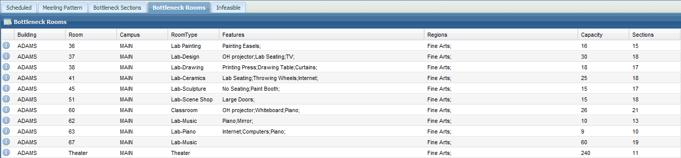 The Bottleneck Rooms tab displays a list of room bottlenecks. The room bottleneck list displays details about all of the rooms that were suitable for sections that were not scheduled because of conflicts. It also shows how many unscheduled sections could have used each of the rooms in question.