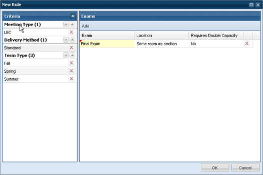 Course records include a delivery method, one or more meeting types per delivery method, and one or more valid term types associated per delivery method. Exam Types are associated with the combination of course delivery, meeting type, and term type. This level of detail is required to determine the specific section offerings and conditions that require exams. For example, the "Standard" delivery of a course may require a "Lecture" and a "Lab" component, and be valid only for "Fall" and "Spring" term types. The Exam Type association may dictate that only the "Lecture" will receive an exam meeting of "Mid-Term" and only for "Fall".